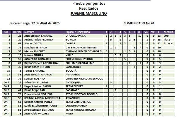 La prueba fue ganada por Juan Esteban Sánchez (Orgullo Paisa) con 33 puntos, seguido por Andrés Felipe Pedraza (Boyacá) con 23 y Simón Loaiza (Caldas) con 12. Por su parte, Santiago Estrada acumuló 10 puntos que lo dejaron a tan solo dos unidades del tercer lugar, consolidándose como uno de los protagonistas de la jornada y mostrando un gran nivel competitivo frente a los mejores del país.